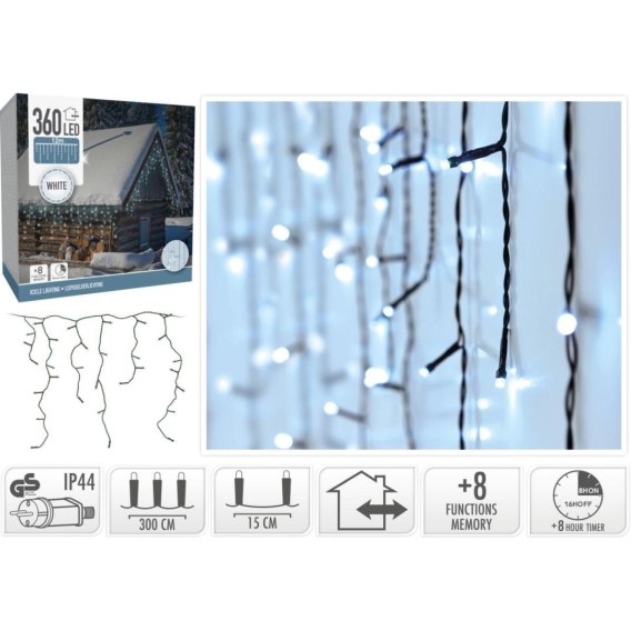 LAMPKI CHOINKOWE KURTYNA ŚWIETLNA ZEW 360 LED STEROWNIK TIMER ZIMNY BIAŁY KABEL TRANSPARENTNY