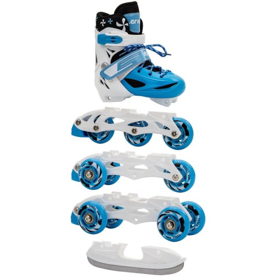 ŁYŻWOROLKI - 3 SKATE - ŁYŻWY- WROTKI 4W1 ENERO gwarantują czystą przyjemność z jazdy. Wyposażone są w lekką i mocną płozę z materiału PP, hamulec przy jednej rolce, kółka PVC o średnicy 64 mm i szerokości 22 mm, regulowane 3 zapięcia oraz regulację rozmiaru. Kółka z tworzywa PVC oraz łożyska ABEC 5 pozwalają na mniejsze opory toczenia, dobrze adoptują się do podłoża, idealnie pasują do nauki lub spokojnej rekreacyjnej jazdy. Wzmocniony wierzch obuwia , szeroki wygodny krój oraz miękka wyściółka wokół kostki zwiększają znacznie komfort użytkowania podczas jazdy. Ostrze łyżwy wykonane ze stali nierdzewnej jest odporne na uszkodzenia oraz rdzę.