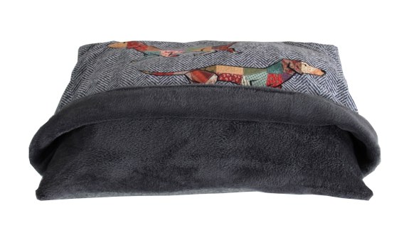 Kołderka z miękkiej tkaniny, uszyta luźno, tak, żeby pies nie miał kłopotu wejść pod nią sam. Wkład do poduszki wyjmowany, poszewkę można wyprać w pralce.