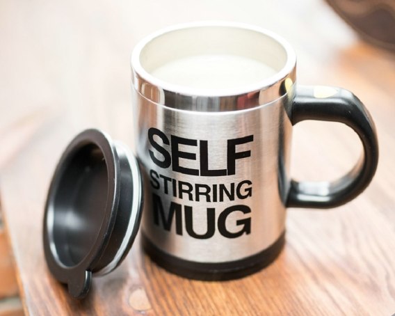 Nowa odsłona leniwego kubka, teraz ze środkiem ze stali szlachetnej! Kubek z którego możesz pić gorącą słodzoną kawę lub herbatę, czekoladę lub pyszną zupkę nadający się dla każdego kto lubi wygodne i bez problemowe życie uznający zasadę, że po co  robić coś, skoro ktoś może zrobić to za ciebie. Cechą która wyróżnia ten kubek od wszystkich innych jest to, że oprócz dużej ilość gorącego płynu jaki w sobie mieści posiada przycisk umieszczony na uchwycie, który uruchamia małe mieszadełko znajdujące się we wnętrzu naczynia. Jego zadaniem jest wymieszanie znajdującej się w nim zawartości bez konieczności użycia do tego celu łyżeczki.