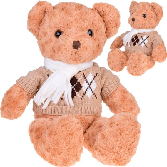 Uroczy, brązowy pluszowy miś to idealna maskotka, która zachwyci każdego miłośnika miękkich przytulanek. Jego duże, brązowe oczka nadają mu wyjątkowo ciepły i przyjazny wyraz, a delikatny materiał sprawia, że jest niezwykle przyjemny w dotyku. Miś ubrany jest w stylowy, elegancki sweterek oraz kremowy szalik, co dodaje mu jeszcze więcej uroku i czyni go gotowym na każde zimowe przygody. To doskonały towarzysz zabaw, który stanie się wiernym przyjacielem zarówno dla dzieci, jak i dorosłych. Idealny prezent na każdą okazję!