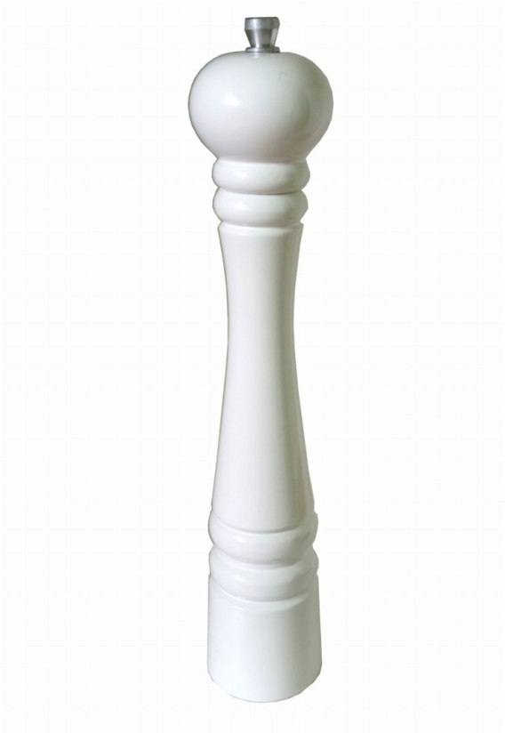 Młynek do pieprzu soli mechanizm stalowy Młynek wykonany z drewna bukowego, wyposażony w stalowy mechanizm mielący. drewno bukowe stalowy mechanizm mielący lakier z wysoki połysk odporny na ścieranie kolor biały Wymiary: wysokość 25 cm średnica 6 cm