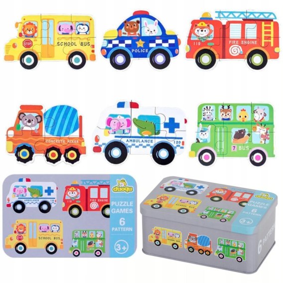 Moje pierwsze grube puzzle pojazdy służbowe 30 sztuk, 6 układanek, kolorowa puszka.
