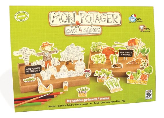 Zestaw kartonowych elementów do stworzenia ogrodu warzywnego na 4 pory roku. Może być również wykorzystany jako gra dla 2 osób (lub 2 dwuosobowych drużyn). Elementy są ponacinane, można więc pracować bez nożyczek. Przy składaniu 2 warzywnych grządek nie ma też potrzeby używania kleju. Warzywa i inne elementy ogrodu można pomalować farbami, flamastrami bądź kredkami. Jeden z 5 strachów na wróble jest do samodzielnego narysowania. Szczegółowa instrukcja obrazkowa krok po kroku znajduje się w środku opakowania. Karton pochodzi w 70% z recyklingu. Nieodpowiednie dla dzieci w wieku poniżej 36 miesięcy. Polecane od szóstego roku życia. Wymiary arkusza 34,5x24 cm. W opakowaniu 4 białe arkusze z warzywami, 4 brązowe arkusze z elementami grządek i 4 strachy na wróble. Made in France. Gra w Sezonowe Warzywa: Ilość graczy: 2 lub 4 w dwuosobowych drużynach Potrzebne elementy: 2 ogródki, wszystkie pokolorowane rośliny i 4 tabliczki z porami roku. Instrukcja gry: Należy wszystkie warzywa położyć wymieszane na stole. Gracz/drużyna losuje tabliczkę z porą roku i umieszcza w swojej grządce. Następnie gracze na zmianę wybierają warzywa odpowiadające ich porze roku, nazywają je na głos i sadzą w swoim ogródku. Ten etap kończy się gdy w każdym ogródku gracze posadzili po 8 warzyw. Później gracze/drużyny zamieniają się ogródkami i sprawdzają czy przeciwnicy nie pomylili się przy wybieraniu roślin. Tutaj przydadzą się 4 plansze z warzywami podzielonymi na pory roku wydrukowane na wewnętrznej stronie opakowania. Jeśli jakieś warzywo zostało zasadzone omyłkowo gracze wyjmują je z grządki. Wygrywa ten gracz/ta drużyna który/która posadziła poprawnie więcej warzyw. Wskazówki: Przechowywanie: Wszystkie warzywa i pozostałe elementy ogrodu można umieścić pod grządkami. 4 plansze z warzywami podzielonymi na pory roku można wyciąć z pudełka i również schować pod grządkami. Język gry: Tabliczki z porami roku są w języku francuskim, druga strona jest jednak biała i można podpisać porę roku w dowolnie wybranym języku (np. polskim). Elementy na planszach z podziałem na pory roku są w języku francuskim i angielskim, jeśli języki te są obce dla graczy warto dopisać nazwy w języku dla nich zrozumiałym (np. polskim). Gra może być jednakowoż wykorzystana do nauki języków.