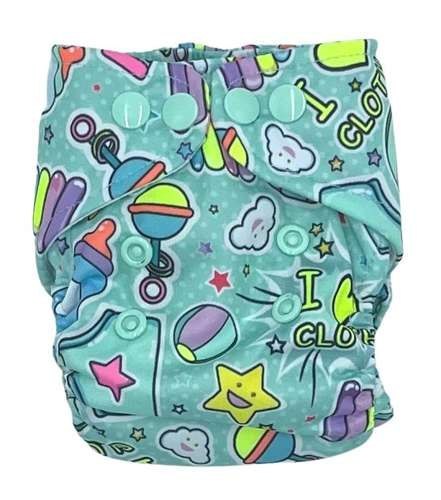 Otulacz ma wewnątrz dwie zakładki przytrzymujące wkład. Gumeczki są wszyte zarówno na plecach, jaki na brzuszku, dzięki pieluszka bardzo dobrze dopasowuje się do ciała dziecka.