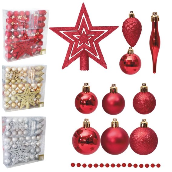 Kolekcja Classy to bombki w tradycyjnych bożonarodzeniowych kolorach - złotym, srebrnym i czerwonym. Komplet zawiera bombki w kilku rodzajach, które pozwalają ubrać świąteczne drzewko w klasyczny sposób. Bombki są nietłukące, dzięki czemu nie stwarzają zagrożenia w domu pełnym dzieci :)Zestaw zawiera: Bombki w różnych rodzajach Girlanda (koraliki) Szpic - gwiazdkę
