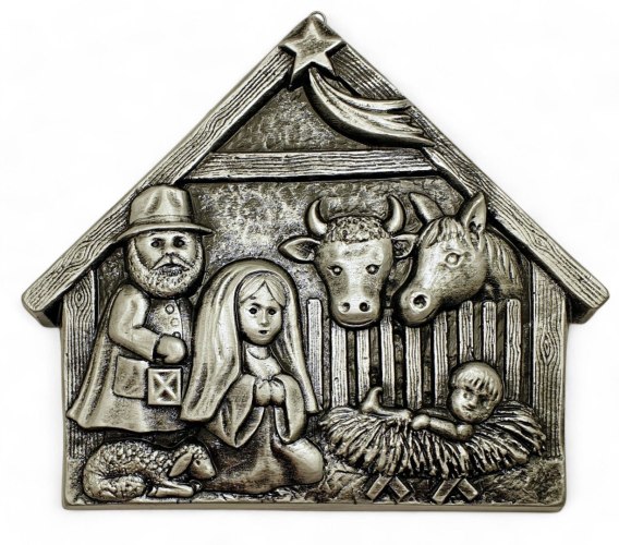 Płaska szopka betlejemska wykonana z gipsu, idealna jako dekoracja bożonarodzeniowa. Przedstawia scenę Narodzenia z figurami Świętej Rodziny, zwierząt oraz gwiazdy betlejemskiej. Wyposażona w zawieszkę, umożliwia łatwe umieszczenie na ścianie. Stylowy i elegancki dodatek do świątecznego wystroju.