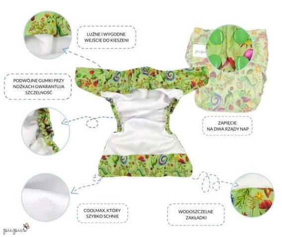 Pieluszka z wnętrzem z coolmaxu, dwoma rzędami nap i podwójnymi gumkami przy nóżkach.