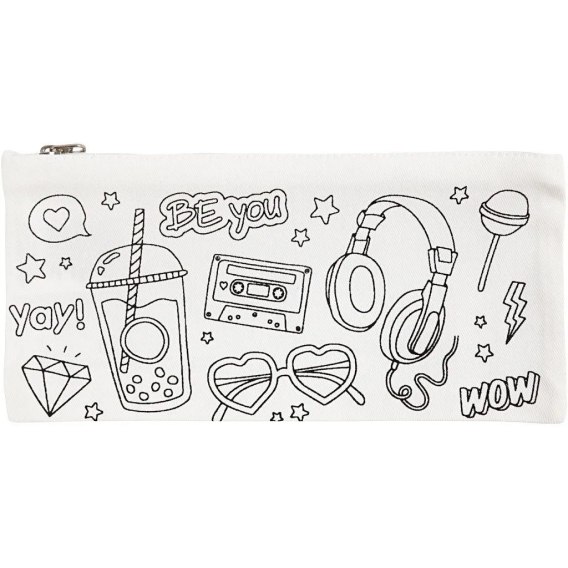 Piórnik ze 100% bawełny do ozdobienia. Wstępnie nadrukowane motywy można łatwo ozdobić markerami tekstylnymi lub farbami do tekstyliów (włóż kartonik pomiędzy warstwy materiału, aby kolory nie przebiły na tył). Ćwicz uważność i spokój dzięki kolorowaniu. Materiał o gramaturze 210 g/m^2. Naturalne składniki tkaniny sprawiają, że do barwienia i malowania możemy użyć farb utrwalanych przez prasowanie gorącym żelazkiem. Zamykany na suwak. Można go używać również jako kosmetyczki. Nieodpowiednie dla dzieci w wieku poniżej 36 miesięcy. Wymiary 23x11 cm.