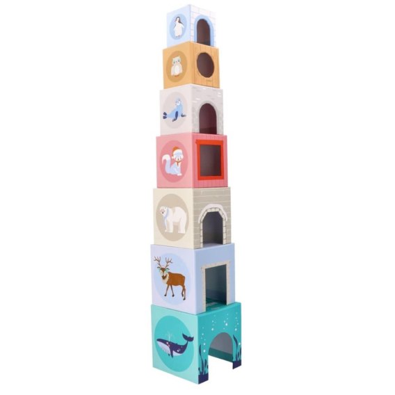 Zestaw składa się z 7 kubeczków różnej wielkości oraz 7 drewnianych klocków przedstawiających urocze arktyczne zwierzęta. Sympatyczna foka, ciekawska sowa śnieżna, majestatyczny wieloryb, wesoły pingwin i inne rozbrykane zwierzaki czekają i przebierają nóżkami z niecierpliwości, aby wspólnie pobawić się z Twoim brzdącem! A możliwości na zabawę jest wiele, gdyż dzieci mogą bawić się tak, jak tylko podpowie im wyobraźnia