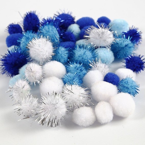 Zestaw zwykłych i brokatowych pomponów. Puszyste akrylowe kuleczki idealne do wielu prac plastycznych. Można z nich zrobić zwierzaczki, użyć jako elementy większych figurek, obkleić nimi ramkę itp. Kolory: biały, błękitny, niebieski. Nieodpowiednie dla dzieci w wieku poniżej 36 miesięcy. Średnica pomponów 15 i 20 mm, w opakowaniu około 48 szt. Made in China.