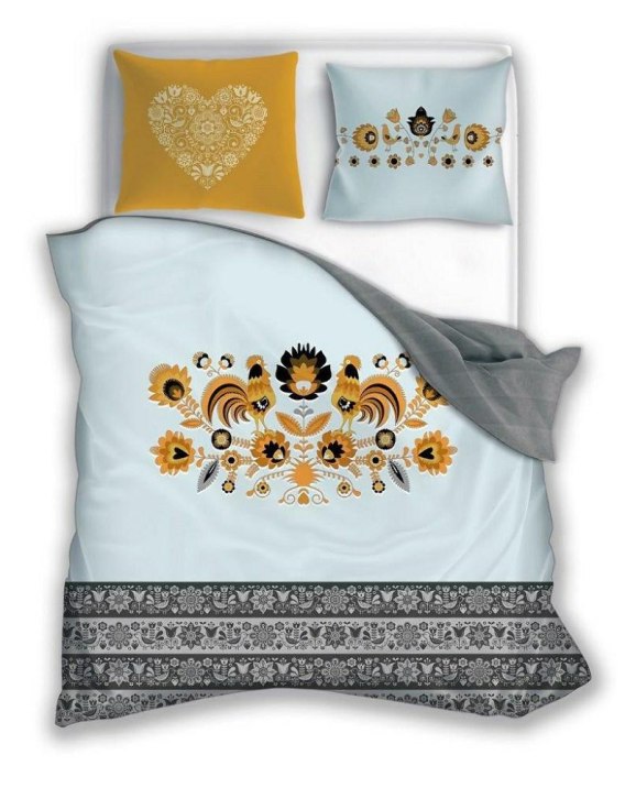 • Pościel bawełniana 160x200 Folk 08 Łowicka Wycinanka koguty błękitna szara żółta kurpiowska folkowa