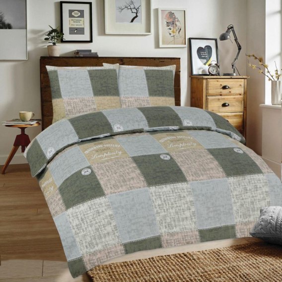 Pościel flanelowa 220x200 F-67A-1 łatki napisy beżowa szara grafitowa