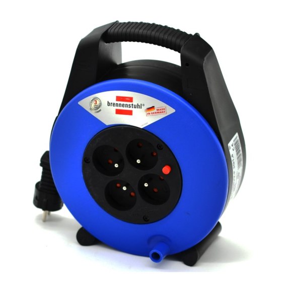 Przedłużacz wewnętrzny zwijany linii vario-Line Box w kolorze czarno/niebieskim posiada 4 gniazda, przewód o długości 15m i parametrach H05VV-F 3G1,5: ✓ 4 gniazdowy przedłużacz bębnowy z uziemieniem, ochroną przed przegrzaniem i kablem o długości 15m. ✓ Zwijany przedłużacz, z praktycznym uchwytem do przenoszenia i dwoma stópkami dla stabilnej podstawy. ✓ Wysokiej klasy obudowa odporna na uszkodzenia wykonana z tworzywa sztucznego. ✓ Przedłużacz z zamkniętą komorą na przewód, do użytku wewnętrznego. ✓ Brennenstuhl