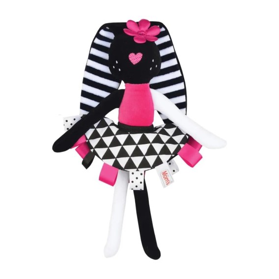 Króliczka posiada długie ręce i nogi, które maluch może swobodnie chwytać, ćwicząc przy tym swoje zdolności manualne. Szeleszczące uszy i spódniczka dostarczają przyjemnych doznań słuchowych, które nie tylko bawią, ale także uspokajają dziecko, przypominając mu szumy, które słyszało będąc w brzuszku mamy.
