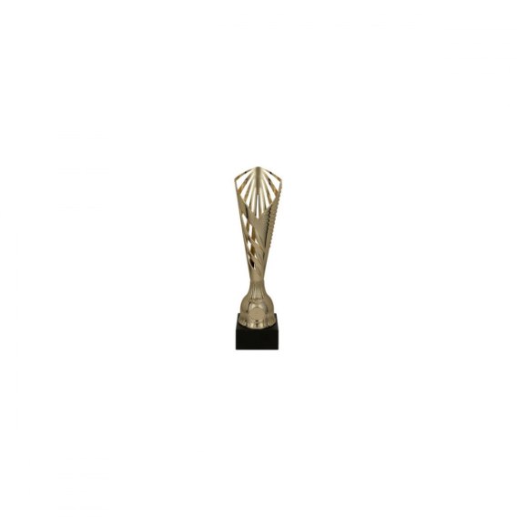 Nowoczesny puchar sportowy zwężający się ku dołowi, poprzecinany otworami na marmurowej podstawie.
