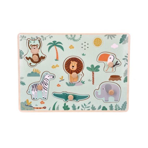 - Zestaw zawiera drewnianą podstawę i 9 wyjmowanych puzzli z uchwytami z wizerunkami fascynujących dzikich zwierząt: małpki, lwa, tukana, krokodyla, słonia i zebry,
