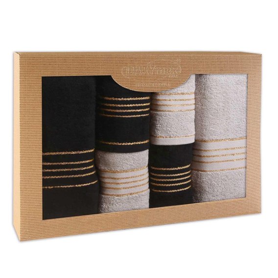 6-częściowy komplet ręczników TIWANO w pudełku. To wysokiej jakości ręczniki wykonane z miękkiej 100% bawełny. Odznaczają się wyjątkową miękkością i doskonałą absorpcją wody. Ich klasyczny design wzbogacony został o subtelną bordiurę w postaci, złotych nici która nadaje całości wyrafinowanego charakteru. Są przyjemne w dotyku - idealne na prezent lub do codziennego użytku z nutą luksusu.