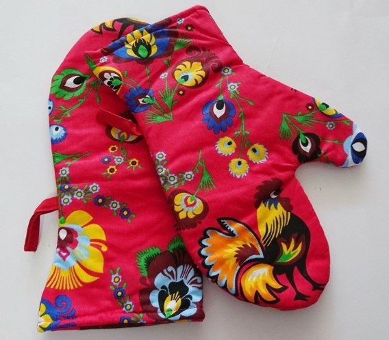 Rękawice kuchenne 17x27 z magnesem 2 szt czerwone łowickie koguty