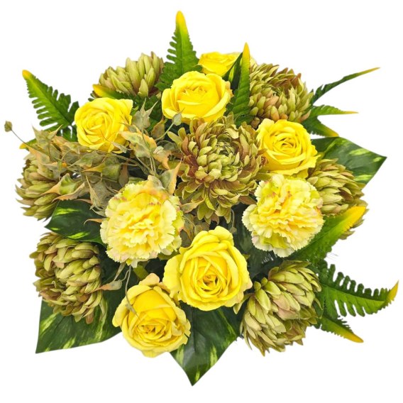 Kompozycje nagrobne z wysokiej jakości sztucznych kwiatów i roślin.