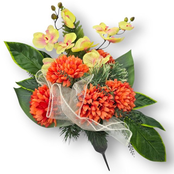 Estetyczny i trwały bukiet sztucznych kwiatów przeznaczony do wbijania w ziemię. Kompozycja umieszczona jest w wazonie na stabilnym plastikowym szpikulcu, co ułatwia umiejscowienie bukietu przy grobie, kapliczce lub krzyżu. Wazon jest obciążony betonem. Naturalny wygląd kwiatów oraz gustowny dodatek w postaci wstążki sprawiają, że dekoracja prezentuje się elegancko i schludnie przez długi czas - niezależnie od warunków atmosferycznych.