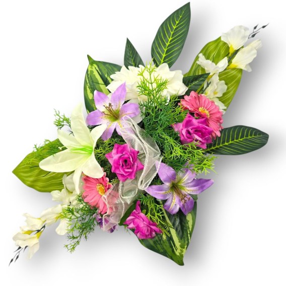 Kompozycje nagrobne z obciążeniem z wysokiej jakości sztucznych kwiatów i roślin.