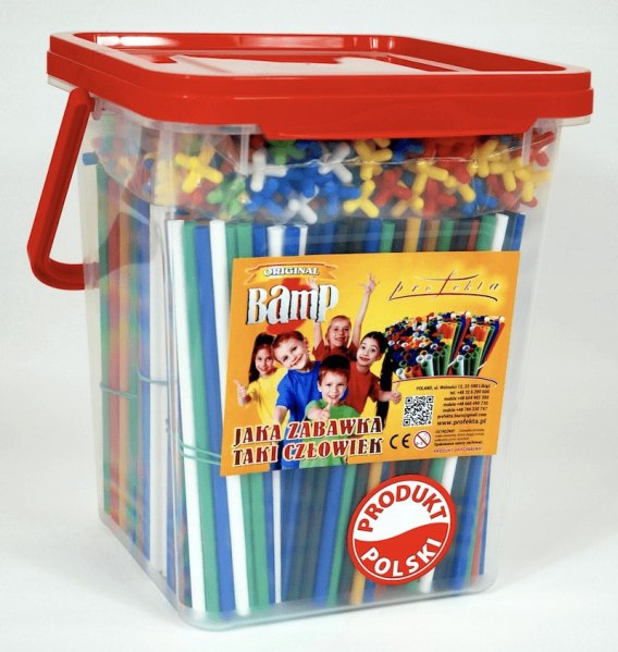 BAMP jest ciekawą i inspirującą układanką przestrzenną składającą się z plastikowych, kolorowych rurek oraz specjalnych łączników. Zestaw 1000 składa się z 540 słomek długości 20 cm, 60 słomek długości 10 cm 400 łączników krzyżykowych. Opakowanie z rączką