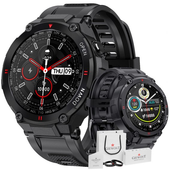 SMARTWATCH GIEWONT GW430 Smukła sportowa opaska, towarzysząca Ci podczas codziennych aktywności. Jej lekka obudowa sprawdzi się znakomicie podczas jazdy na rowerze, biegania i uprawiania innych sportów (z 7 różnych dyscyplin). Z tym smartwatchem możesz w pełni cieszyć się z każdego ruchu - opaska Giewont GW430 pozwoli Ci zaplanować i kontrolować czas, dystans, spalanie kalorii i efekt treningu. Z tym smartwatchem nie przegapisz tego, co ważne. Wiadomości z Facebook, Twitter, Whatsapp, Skype itp. wyświetlane są na zegarku w czasie rzeczywistym - wystarczy podnieść rękę, aby wyświetlić wiadomości! Nie musisz się odrywać od aktywności, ta opaska dotrzymuje Ci kroku podczas przygody, która się już rozpoczęła i trwa. Smartwatch Giewont GW430 posiada klasę wodoszczelności IP67, dlatego jest odporna na przypadkowe zalania, zachlapania oraz deszcz. Dodatkowo Giewont GW430 po podłączeniu z aplikacją wyświetla dane o pogodzie - informacje, są odświeżane co godzinę. Dlatego teraz możesz dostosować aktywność do warunków pogodowych i cieszyć się treningiem zarówno w słoneczne jak i deszczowe dni. Całość dopełnia funkcja bezprzewodowego robienia zdjęć z aparatu telefonu za pomogą bezprzewodowego połączenia z zegarkiem.
