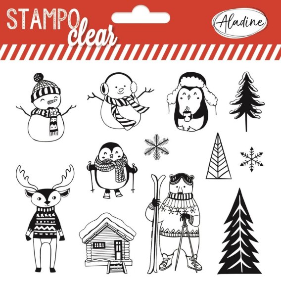Zestaw giętkich stempelków z przezroczystego silikonu. Stemple z motywem zwierząt i bałwanków cieszących się zimą. Stempelki wymagają rączki w postaci bloku akrylu lub szkła, do której przyczepiają się na zasadzie przyssawki. Służą do ozdabiania kartek okolicznościowych, albumów, wszelkich ozdób z kartonu, pamiętników (również techniką embossingu), drewna i dowolnej innej powierzchni (trzeba dobrać do niej odpowiednie preparaty). Tusz lub farbę należy dokupić osobno. Nieodpowiednie dla dzieci w wieku poniżej 36 miesięcy. Wymiary stempelków 1,5 - 5,8 cm. Made in China.