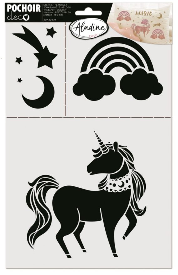 Niesamoprzylepny szablon z cienkiego, giętkiego plastiku. Nadaje się do użytku na tkaninach, papierze (scrapbooking, embossing), kartonie, betonie, drewnie, szkle itp. Można na nim stosować farby akrylowe lub naturalne, kleje, tusze do papieru lub tkanin, pasty strukturalne, farby w sprayu itp. Jeśli nie planujemy pracować na papierze, można na nim zastosować klej do szablonów, aby zapobiec podciekaniu farby pod spód. Szczególnie przydatne jest to w przypadku pracy na tkaninach. Nieodpowiednie dla dzieci w wieku poniżej 36 miesięcy. Wymiary arkusza 30x20 cm, arkusz jest wstępnie ponacinany, aby można było rozdzielić wszystkie wzory. Made in China.