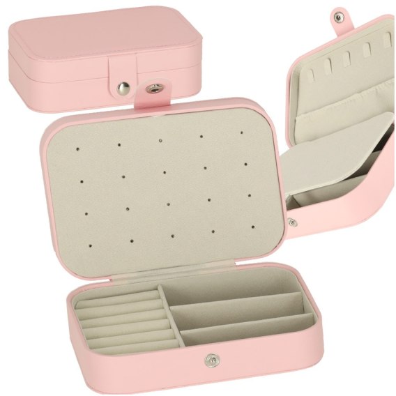 To pastelowo różowa kasetka na biżuterię, która zachwyca delikatnym kolorem i subtelnym, jasnym wnętrzem, doskonale komponując się z aranżacją każdej toaletki. To stylowa szkatułka, która mimo kompaktowych wymiarów zaskakuje funkcjonalnością i pojemnością. Dzięki inteligentnie zaprojektowanym przegródkom, haczykom oraz specjalnym miejscom na pierścionki i kolczyki pozwala na wygodne przechowywanie różnych elementów biżuterii, dbając jednocześnie o ich bezpieczeństwo. To idealny wybór dla miłośniczek biżuterii, które cenią pastelową elegancję, nowoczesne szkatułki i praktyczne rozwiązania w jednym organizerze.