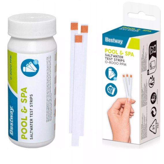 Paski kontrolne do mierzenia zasolenia w łatwy i szybki sposób pozwalają na sprawdzenie stanu wody w basenie lub jacuzzi. Wystarczy na klika sekund zanurzyć pasek w wodzie i zaraz po wyjęciu porównać kolor paska do skali podanej na opakowaniu, aby odczytać poziom zasolenia. Regularne sprawdzanie poziomu zasolenia w basenie pozwoli na utrzymanie krystalicznej i bezpiecznej wody, dzięki czemu kąpiele będą przyjemne i relaksujące.