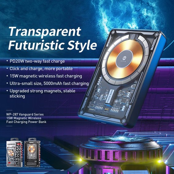 Power bank WEKOME WP-287 Vanguard Series wyposażony w przenośną ładowarkę magnetyczną to niezwykle stylowa i wytrzymała konstrukcja, która pozwala na wygodne i bezpieczne użytkowanie w każdych warunkach.