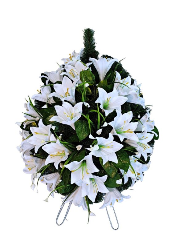 Nasz wieniec pogrzebowy cechuje się wyjątkowo gęstym splotem sztucznych gałązek iglastych, które tworzą estetycznie wyglądające tło dla unikalnej kompozycji kwiatów. Starannie dobrane kwiaty są niezwykle realistyczne i naturalne, dodając wiązance autentyczności i podkreślając jej uroczysty charakter.