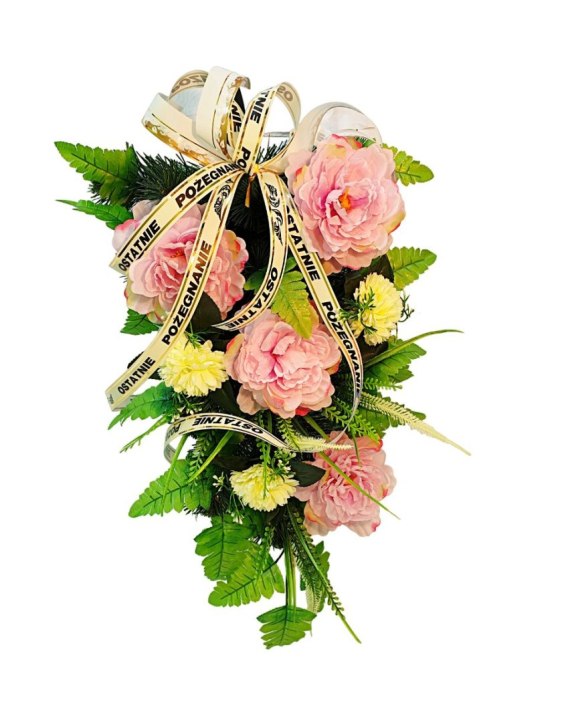 Nasz wieniec pogrzebowy cechuje się wyjątkowo gęstym splotem sztucznych gałązek iglastych, które tworzą estetycznie wyglądające tło dla unikalnej kompozycji kwiatów. Starannie dobrane kwiaty są niezwykle realistyczne i naturalne, dodając wiązance autentyczności i podkreślając jej uroczysty charakter.