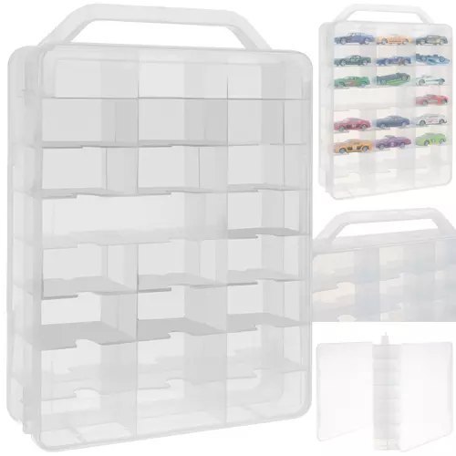 - DWUSTRONNA - walizka jest wyposażona z dwóch stron w drzwiczki, a z każdej ze stron po 23 miejsca na samochodziki. Drzwiczki są zamykane na zaciski, dzięki temu autka nie wypadną.