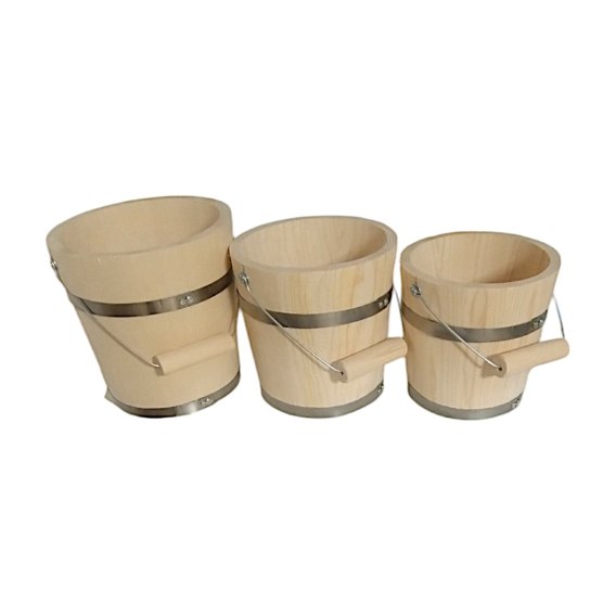 Tradycyjne wiadro drewniane z jodły wykonane ręcznie przez doświadczonych rzemieślników metodami bednarskimi. Zestaw zawiera trzy solidne i estetyczne wiadra w różnych rozmiarach, stworzone z wysokogatunkowego drewna jodłowego i wzmocnione metalowymi obręczami ze stali nierdzewnej dla zapewnienia trwałości oraz szczelności.