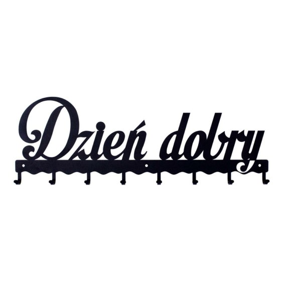 Wieszak ścienny Dzień dobry jest praktycznym rozwiązaniem do każdego przedpokoju, holu lub poczekalni. Wycinany laserowo uniwersalny napis ociepli każde wnętrze.Produkt wykonany został z wytrzymałego metalu malowanego proszkowo. Wieszak posiada 8 haczyków, o maksymalnym obiciążeniu 3kg każdy, które pomogą utrzymać porządek na korytarzu, holu czy poczekalni. Utrzymany w eleganckim stylu wieszak wtopi się we wnętrze dodając mu wyjątkowo przytulnego charakteru. Maksymalne obciążenie listwy to 24kg. Do wieszaka załączony jest zestaw montażowy, składający się z kołków, śrubek i zaślepek. Wysokość: 21cm Szerokość: 60cm Max. ilość sztuk w kartonie:1 Wymiary kartonu:20cm x 52cm x 4cm Waga opakowania: 2kg