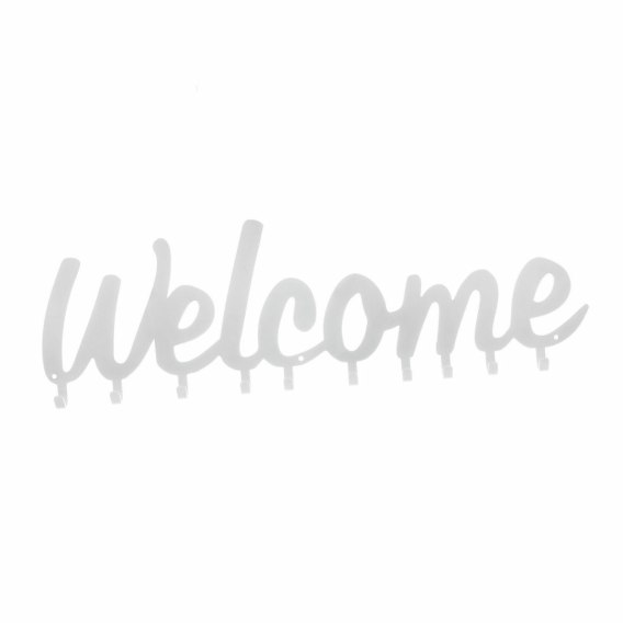Wieszak ścienny Welcome to nowoczesne rozwiązanie do przedpokoju, holu lub poczekalni. Jego precyzyjnie wycięty laserowo wzór, z napisem witającym gości, nada uroku każdemu wnętrzu. Stalowy malowany proszkowo wieszak jest uniwersalny oraz odporny na uszkodzenia. Matowe wykończenie dodaje listwie stylu. Dzięki aż 10 haczykom o udźwigu do 3kg każdy, możemy powiesić na wieszaku klucze, kurtki lub nawet torby. Produkt dostępny jest w dwóch kolorach co zwiększa jego możliwości aranżacyjne. Maksymalne obciążenie to 30kg. Do wieszaka załączany jest zestaw montażowy, który składa się z kołków, zaślepek i śrubek.