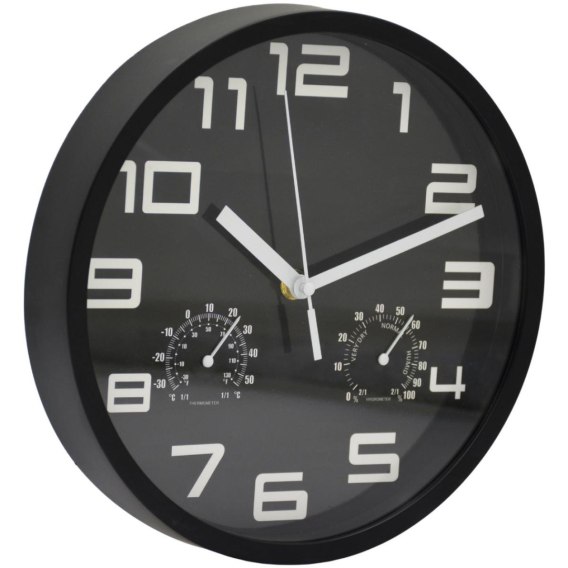 ZEGAR ŚCIENNY 25CM Z TERMOMETREM CZARNY to nowoczesny zegar z wyraźnym wyświetlaczem czasu, temperatury i stopnia wilgotności powietrza. Ma prosty, minimalistyczny wygląd i jest idealny do biur, nowoczesnych wnętrz a nawet miejsc pracy.