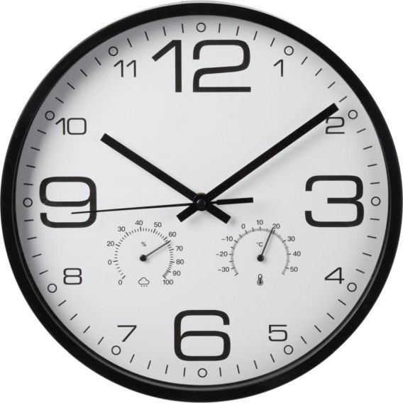 ZEGAR ŚCIENNY 30CM Z TERMOMETREM CZARNY to nowoczesny zegar z wyraźnym wyświetlaczem czasu, temperatury i stopnia wilgotności powietrza. Ma prosty, minimalistyczny wygląd i jest idealny do biur, nowoczesnych wnętrz a nawet miejsc pracy.