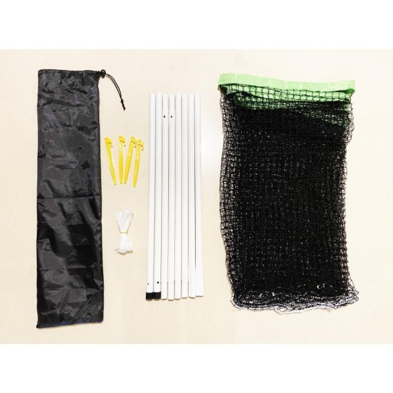 • 8 x metalowe słupki o dł. 59 cm,śr.19 mm i grubości ścianki 0,1 mm, 4 plastikowe śledzie, siatka, linki napinające, pokrowiec