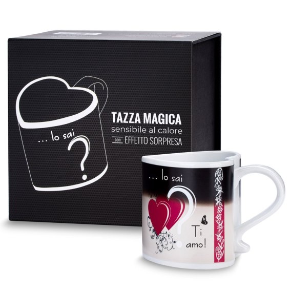 Magiczny kubek zmieniający kolor:Zaskakujący Kubeczek Deluxe to termoaktywny kubek w kształcie serca z ukrytą wiadomością, zapakowany w eleganckie pudełko prezentowe. Na pierwszy rzut oka, wszystko, co na nim widać, to pytanie Wiesz co?, umieszczone na czarnym tle. Kiedy wlejesz do kubka gorący napój, jego wygląd całkowicie się zmieni. Czarna farba stopniowo zaniknie, odsłaniając serca i napis Kocham Cię. Nie tylko na Walentynki:Chociaż ten prezent w szczególności sprawdzi się podczas Dnia Zakochanych czy rocznicy, każdy inny dzień jest równie dobry, by powiedzieć komuś “kocham Cię”. Miłosny kubeczek zmieniający wygląd, ukryty w czarnym pudełku prezentowym, idealnie nadaje się też na prezent bez okazji, zarówno dla niej, jak i dla niego. Zaskakująca wiadomość w takiej formie rozbudzi uczucia i rozjaśni każdy dzień kochanej osoby. Wyraź uczucia przez zaskoczenie:Najlepszym sposobem na wyrażenie swoich uczuć jest zrobienie tego przez zaskoczenie. Taki czuły gest zrobi wrażenie na ukochanej osobie i zostanie zapamiętany, a każda kawa lub herbata będzie się jej z Tobą kojarzyć. Kubeczek zapakowany jest w eleganckie pudełko prezentowe, więc już przed otwarciem rozbudza wyobraźnię. Jeśli chcesz zrobić przyjemność także sobie, pusty kubeczek zalej gorącym napojem na oczach drugiej połówki i obserwuj jej reakcję. Jak to działa:Kubek został pokryty specjalną farbą, która - gdy kubeczek jest gorący - stopniowo odkrywa ukrytą wiadomość. Jeśli chcesz zrobić komuś niespodziankę, wystarczy, że wlejesz do niego gorący napój. Gdy ostudzisz kubek, serce i napis stopniowo zanikną. Ten gadżet to wymarzony prezent dla dziewczyny – skrywa w sobie tajemnicę, jest uroczy, odwołuje się do uczuć, a do tego jest ładnie zapakowany.