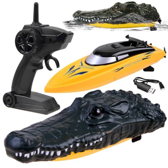 Zdalnie sterowana Łódka Krokodyl to motorówka budząca respekt na wodzie. Zabawka 2w1 ma opcję nałożenia nakładki na łódkę w postaci głowy krokodyla. Kształt głowy krokodyla został odwzorowany bardzo realistycznie. Ostre i gładkie zęby, brązowe oczy oraz ciemno zielona skóra pokryta łuskami przypominają prawdziwego krokodyla. Naprawdę można kogoś przestraszyć.
