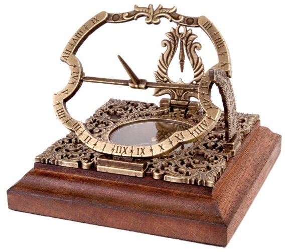Mosiężny zegar słoneczny Habsburg H30 - reprodukcja. Przepiękny, bogato zdobiony zegar słoneczny Habsbug. Na drewnianej podstawie. Wys. 10cm, szer. 10cm,. Uniwersalny zegar słoneczny orginalnie zbudowany w Niemczech, styl augsburski, model z XVIIIw.