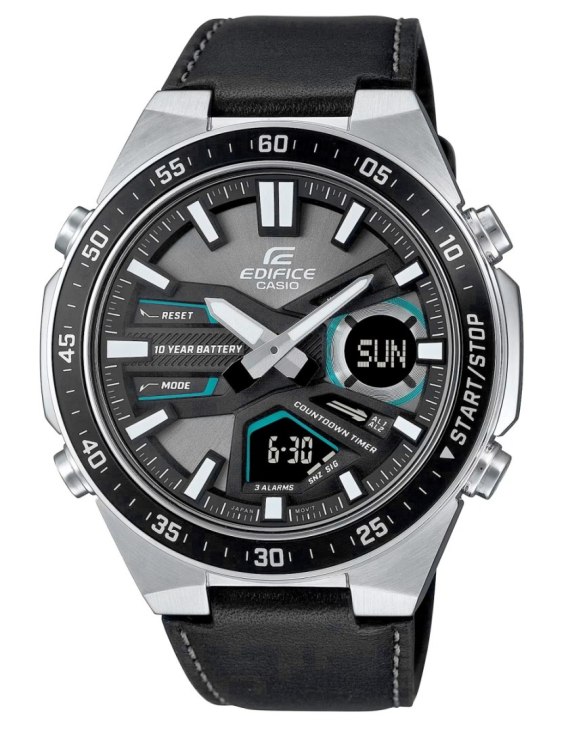 Zegarek Męski CASIO EDIFICE EVF-C110L-1AVEF wyposażony jest w działające chronografy: czas światowy- wyświetla aktualny czas w głównych miastach oraz w określonych obszarach na świecie; timer - 1/1 min. - 24 h- sygnał dźwiękowy o wybranej godzinie pozwala zapamiętać specjalne lub powtarzające się zdarzenia. Czas może być ustawiony z dokładnością do 1 minuty i do 24 godzin wcześniej. Model ten posiada dwa niezależne liczniki czasu; format 12-/24-godzinny- można ustawić wyświetlanie czasu w formacie 12- lub 24-godzinnym. W trybie 12-godzinnym na wyświetlaczu w drugiej połowie doby, tzn. od godziny 12 do 23:59, obok godziny pojawia się literka p.; funkcja drzemki- po włączeniu funkcji drzemki alarm rozlega się ponownie po kilku minutach; pamięć 30 numerów- możliwość zapisania 30 numerów telefonów, zawierających do 12 cyfr z nazwą do 8 znaków; stoper - 1/100 sek. - 24 h- dokładność pomiaru do 1/100 sekundy, zakres pomiaru do 24 h; 3 alarmy dziennie- alarm dzienny przypomina o wydarzeniach, które powtarzają się każdego dnia, emitując sygnał dźwiękowy. Ten typ alarmu pozwala na ustawianie 3 niezależnych alarmów; kalendarz automatyczny- raz ustawiony zegarek zawsze wyświetla poprawną datę (pamięta o krótszych miesiącach).