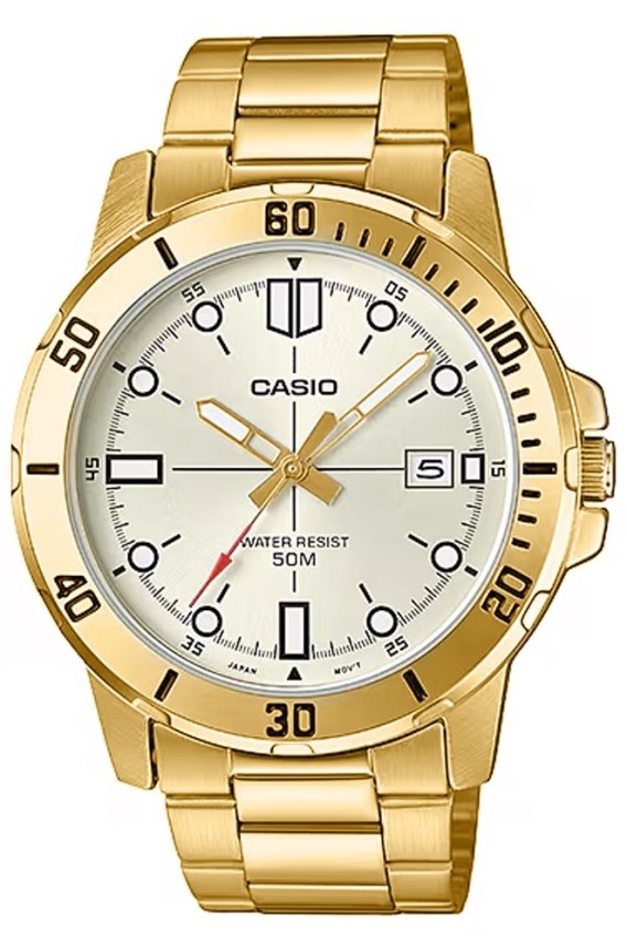 Zdecydowany i elegancki model CASIO przyciągający uwagę już od pierwszego spojrzenia. Koperta o średnicy 44 mm, w całości utrzymana w efektownym odcieniu złota, skrywa jasną, subtelnie połyskującą tarczę z mocnymi indeksami i wyrazistym, czerwonym grotem sekundnika. Solidne wskazówki i kontrastowe oznaczenia godzinowe zapewniają wysoką czytelność w każdych warunkach. Datownik przy godzinie trzeciej pozwala zachować kontrolę nad czasem, a wodoodporność na poziomie 50M daje swobodę ruchu - niezależnie od pogody czy sytuacji. Uzupełnieniem jest złota bransoleta z potrójnym zapięciem - wygodna, trwała i doskonale dopasowana do dynamicznego trybu życia. Precyzyjny mechanizm kwarcowy gwarantuje punktualność, jakiej potrzebujesz na co dzień.