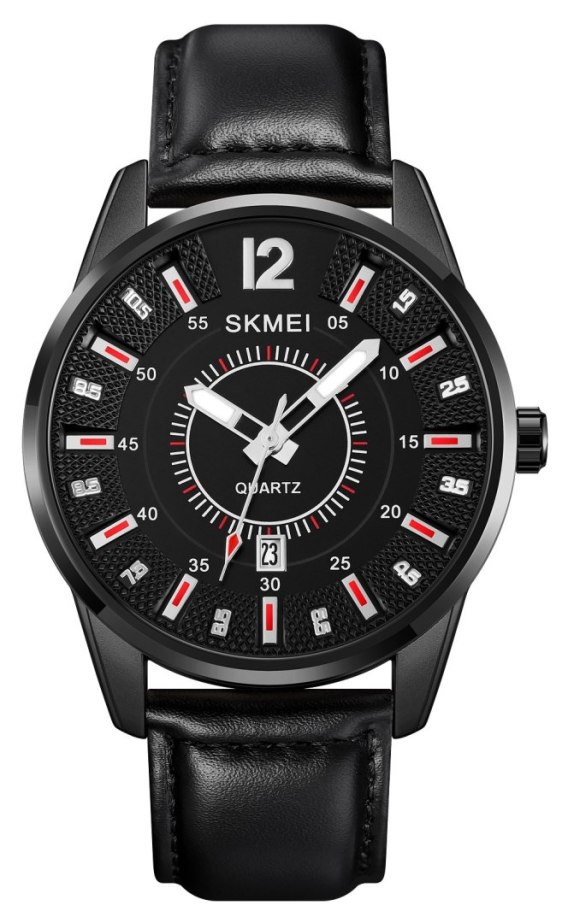 Tarcza Skmei 1993BK jest przemyślana i pełna detali, które razem tworzą stylowy, a zarazem dynamiczny design - idealny dla mężczyzny, który ceni zarówno elegancję, jak i funkcjonalność. Czerwone detale na indeksach i wokół centralnego okręgu dodają całości wyrazistości, wprowadzając nutę sportowego charakteru. To kontrast, który przyciąga wzrok i sprawia, że każdy element tarczy jest łatwo zauważalny.