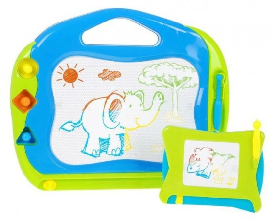 | Część do pisania jest w kolorze białym. Z lewej strony umieszczono 3 pieczątki o różnych kształtach (koło, kwadrat, trójkąt), które dodatkowo urozmaicą edukacyjną zabawę. Pod obszarem do rysowania umieszczono suwak, którego przesunięcie powoduje zmazywanie rysunków. Płaszczyzna do rysowania ma wbudowane 4 kolory w podkładzie (czerwony, zielony, niebieski i żółty). Rysujemy specjalnym rysikiem umieszczonym po prawej stronie znikopisu. Rysik jest zamocowany na praktycznej lince, co pozwala zapobiec jego zgubieniu w ferworze zabawy. |