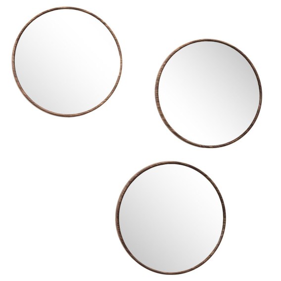 Zestaw trzech okrągłych luster o średnicy 26cm. Lustra wykonane zostały z ramy z tworzywa sztucznego imitującego ciemne drewno orzecha. Zestaw 3 luster idealnych do powieszenia na ścianę w przedpokoju lub poczekalni.